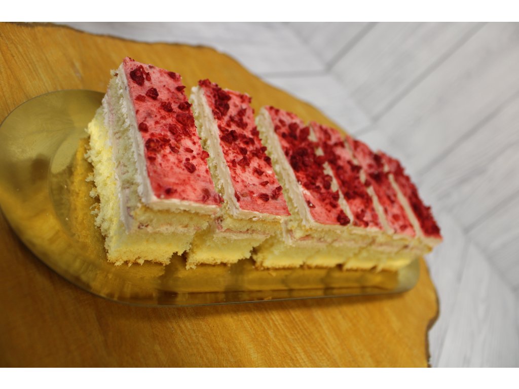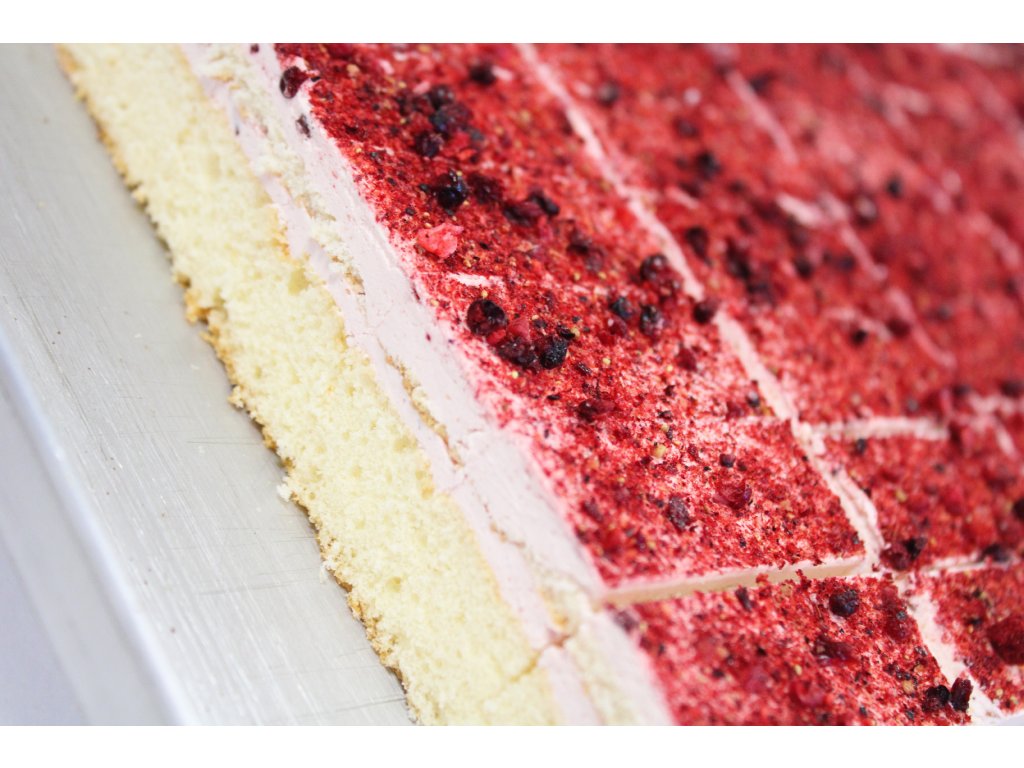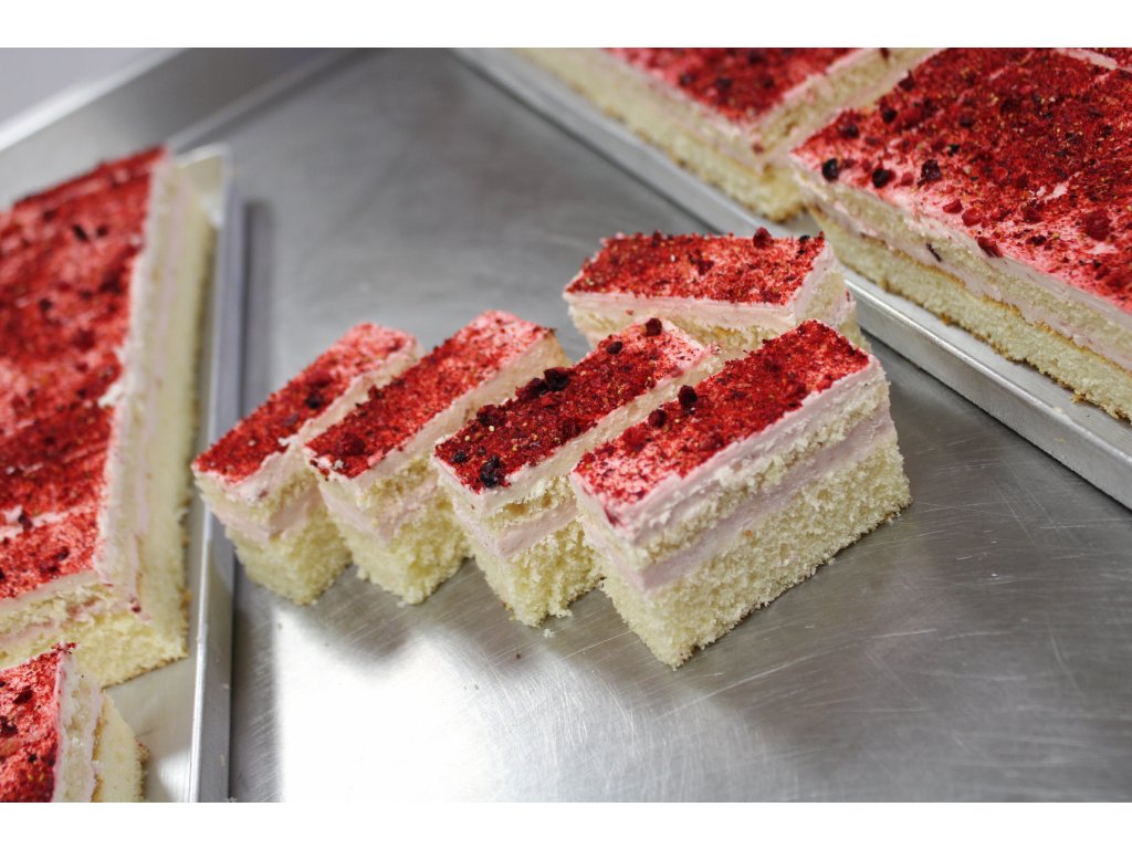 Jemný dezert z nadýchanej svetlej piškóty, lahodného krému a ovocnej malinovej plnky. Povrch zdobí 100 % lyofilizovaná malina, ktorá dodáva rezu sviežu chuť.