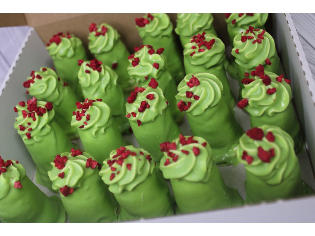 PŠENIČNÁ MÚKA, práškový cukor, VAJEČNÝ ŽĽTOK, rastlinné oleje (palmový, repkový, kokosový) a tuky (palmový, plne stužený palmojadrový olej), voda, emulgátory (mono a diglyceridy mastných kyselín, lecitín repkový a sójový (E322)), soľ (0,1%), konzervačné látky (kyselina sorbová, E202), regulátory kyslosti (kyselina citrónová, E330), maslová a vanilková aróma, farbivá (beta-karotén, E133, E102), glycerol (E422), stabilizátory (E476, E492), jahody (kusové ovocie 25%), maliny (kusové ovocie 25%), ovocné pretlaky (jablko, višňa, arónia), glukózovo-fruktózový sirup, modifikovaný škrob (E1422), zahusťovadlá (E418), koncentrát z čiernej mrkvy, lyofilizované maliny, sušené odtučnené MLIEKO, kakaový prášok alkalizovaný 10-12%, invertný cukrový sirup, MANDĽOVÁ PASTA, PISTÁCIOVÁ PASTA (5%), LIESKOVOORIEŠKOVÁ PASTA, koncentráty (mrkva, spirulina), prírodná aróma.